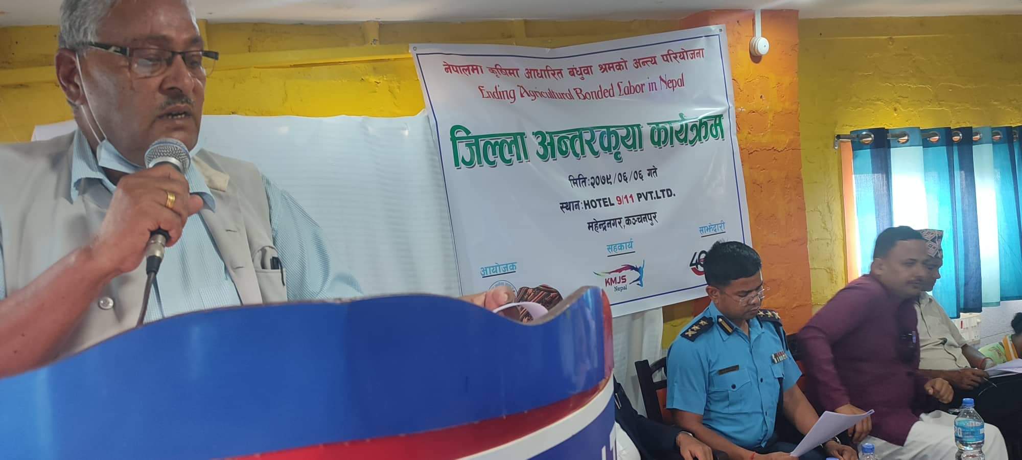 मुक्त कमैया समाज कञ्चनपुरकाे एक दिने अन्तरक्रिया कार्यक्रम बिहिवार महेन्द्रनगरमा सम्पन्न भएको छ । प्रमुख अतिथीको आसन बाट बोल्दै मुक्त कमैया समाजका केन्द्रिय उपाध्यक्ष जगन्नाथ डंगौराले अझै पनि मुक्त कमैयाहरु पुर्नस्थापना हुन बाकी रहेका र लालझाडी गाउपालिका वडा नं.६ खैरगढैया मुक्त कमैया बस्तीको नक्सा श्रेष्टा कायम नभएको बताउनु भएको छ । यसैगरी बिशिष्ट अतिथी कञ्चनपुरका प्रमुख जिल्ला अधिकारी गोपाल प्रसाद अर्यालले मुक्त कमैयाहरुको सबै समस्या नितिगत रुपमा समाधान गरिनु पर्ने बताउदै मुक्त कमैया युवा युवतिहरुलाई विधि र प्रकृया अनुसार नै म्यादी प्रहरीमा भर्ना लिइने कुरा राख्नु भयो । यस्तै बिशिष्ट अतिथी नापी कार्यालयका प्रतिनिधि पुष्कर बहादुर पालले यदी अधिकार सम्पन्न मुक्त कमैया पुर्नस्थापना आयोग बाट नापी भएको हो भने सबै बस्तीको नक्सा श्रेष्टा कायम भएको हुनु पर्ने बताउनु भयो । यसैगरी नेकपा माओवादी केन्द्र कञ्चनपुरका प्रतिनिधि कृष्णदत्त जोशीले कमैयाहरुलाई मुक्ती गराउनका लागि नै नेकपा माओवादीले जनयुद्ध गरेको बताउनु भयो । यसैगरी नेपाली कांग्रेश कञ्चनपुरका सचिव भिमराज भट्टले बधुवा दासको रुपमा रहेका कमैयाहरुलाई कांग्रेश सभापति शेरबहादुर देउवाले नै मुक्तिको घोषणा गरेको दाबी गर्नु भयो । यसैगरी पुर्व संविधानसभा सदस्य दुर्गादेबी खुनाले मुक्त कमैयालाई रोजगारमा आरक्षण कोटा सुनिश्चित गरिनु पर्ने लगायतका अन्य समस्या तत्काल राज्यले सम्बोधन गर्नु पर्ने बताएकी छिन् । यसैगरी कमैया महिला जागरण समाजकी केन्द्रिय अध्यक्ष बिष्णी थारुले मुक्त कमैयाले पाएको जग्गा फुकुवा गरिनु पर्ने र बैंकिङ्ग कारोबारका लागि सहज वातावरण सिर्जना गरिनु पर्नेमा जोड दिनु भएको छ । मुक्त कमैया समाज कञ्चनपुरले आयोजना गरेको नेपालमा कृषीमा आधारित ब“धुवा श्रमको अन्त्य परियोजना अन्र्तगत जिल्ला अन्तरकृया कार्यक्रम समाजका अध्यक्ष रामप्रसाद रानाको सभापतित्वमा सम्पन्न भएको थियो भने कार्यक्रममा कार्यपत्र सहजकर्ताको रुपमा अधिवक्ता जयदेब जोशीले प्रस्तुत गर्नु भएको थियो ।